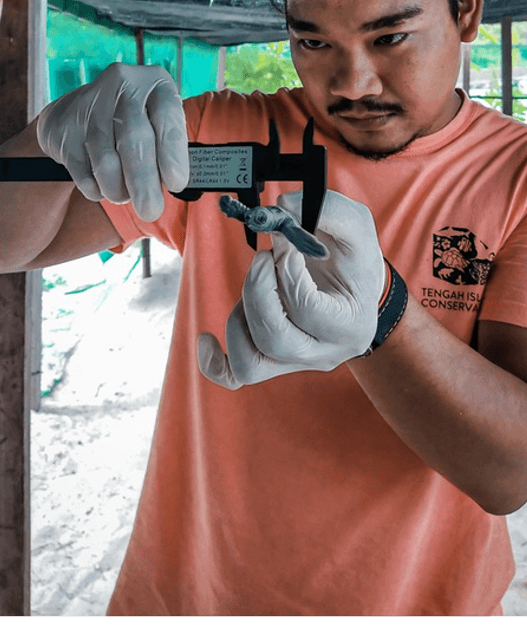 Tengah Island Conservation volunteer carefully measuring the size of a turtle hatchling for record purposes.