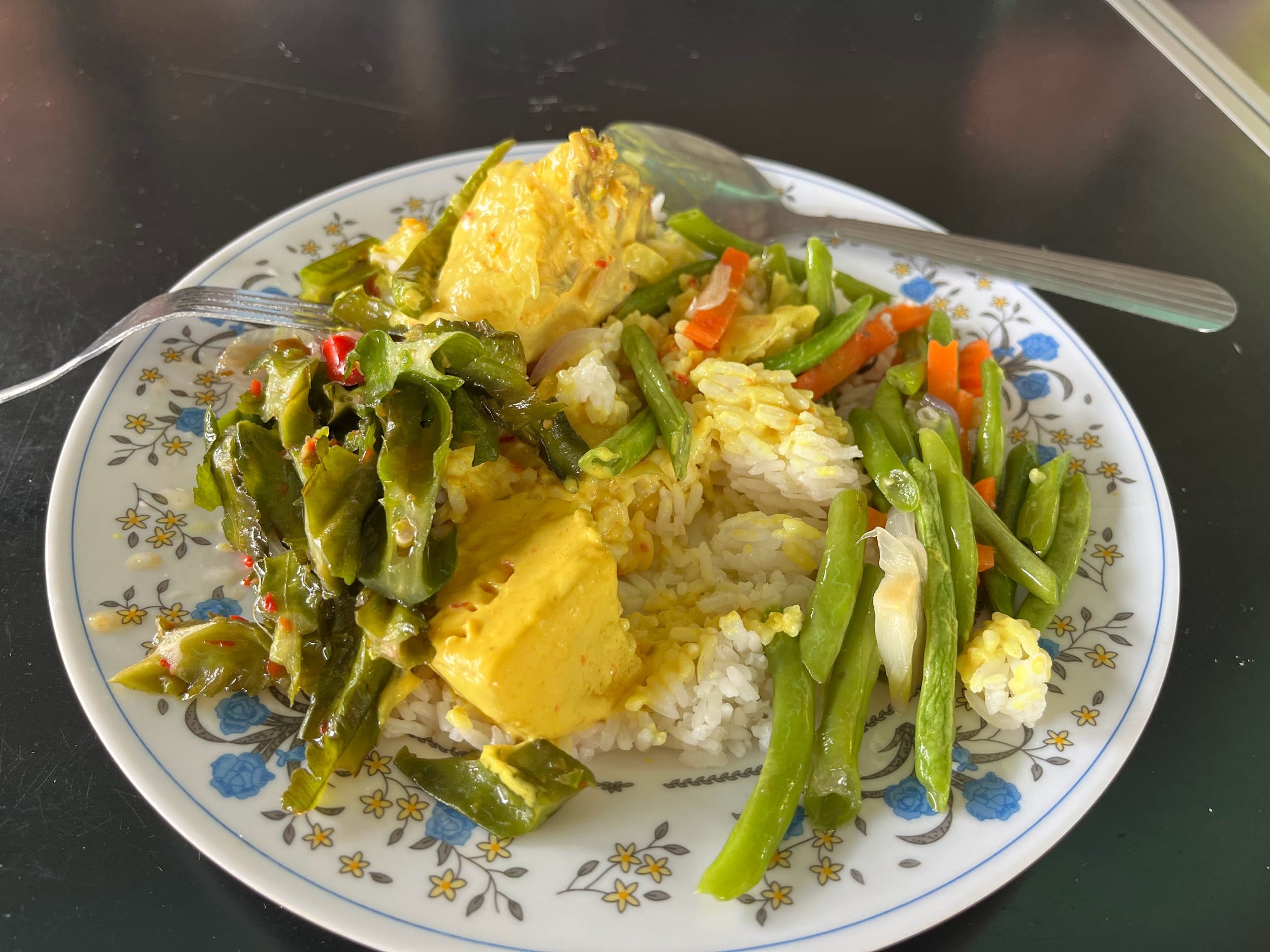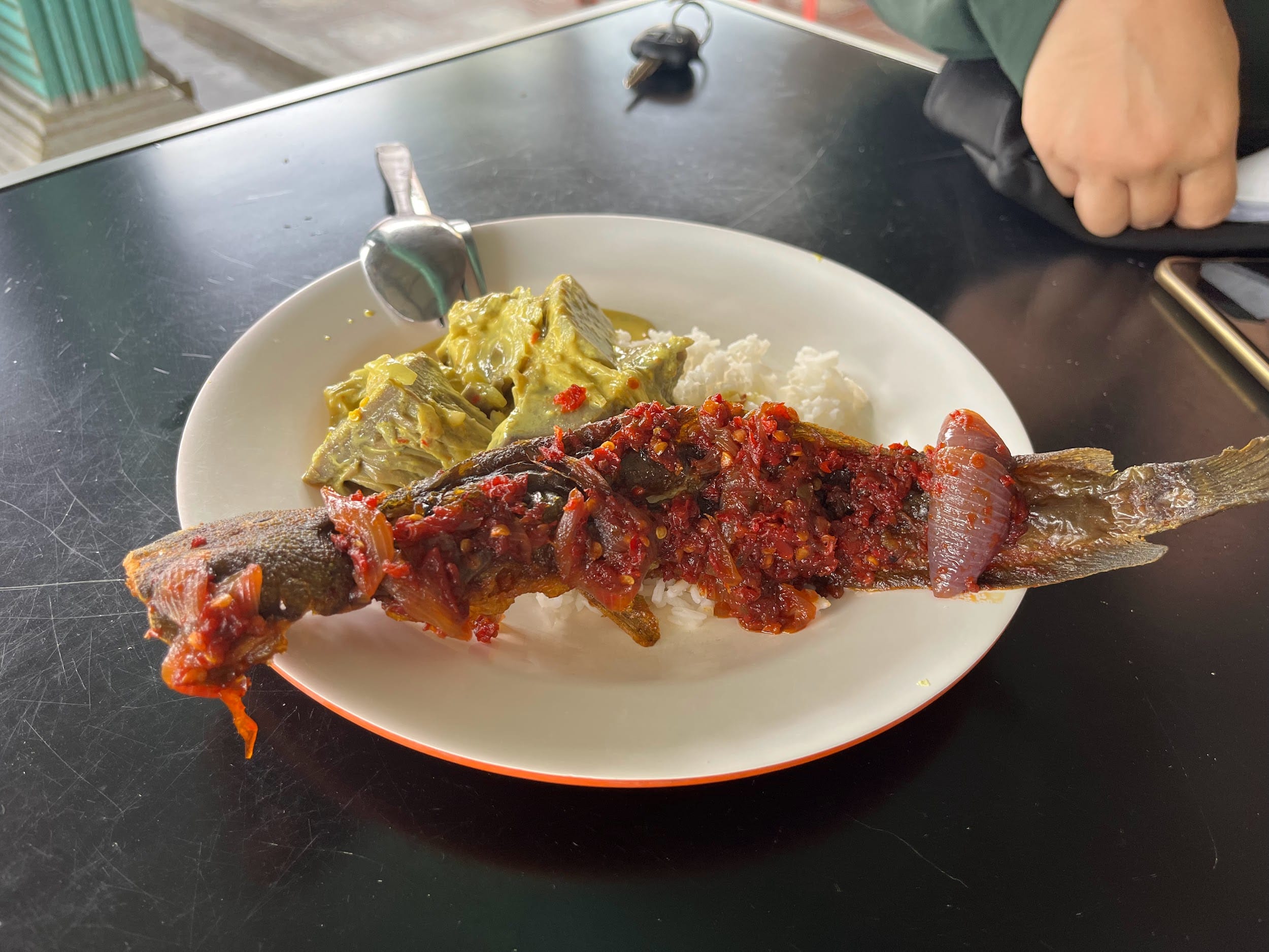 One of Justine’s favourite meals is fried catfish! Here it is complemented with rice and a cempedak coconut curry.